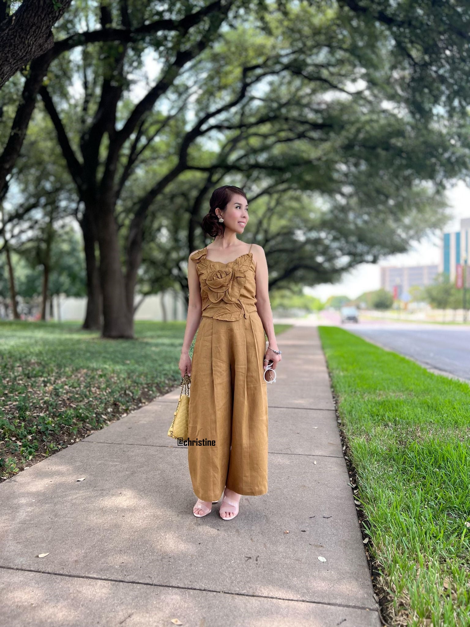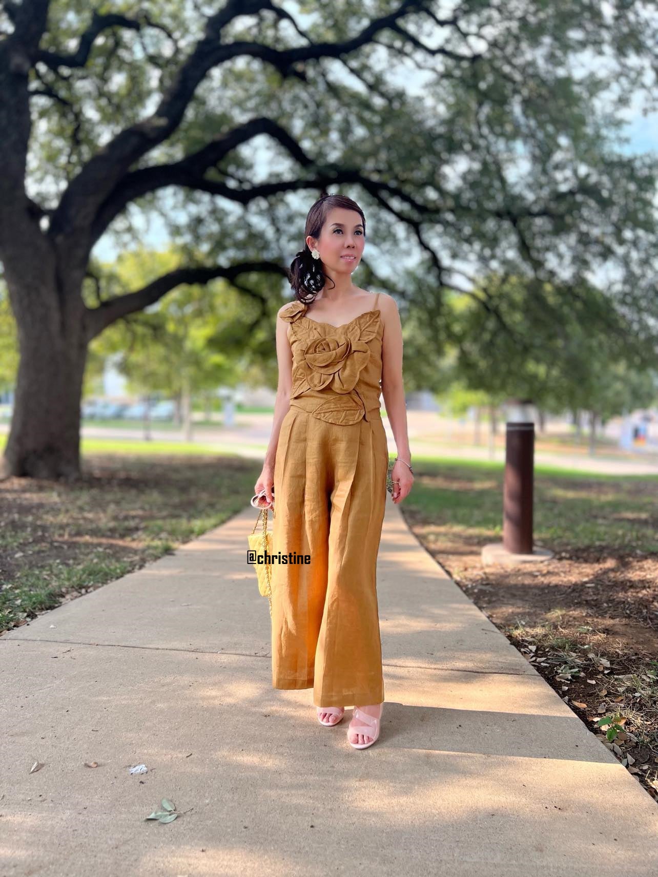 Lilian pants set in linen 3D flower top is perfect for summer wear that transitions smoothly into fall. The pants come with a length of 35", and the top features stylish 3D flowers. For cooler weather, simply add a turtleneck under the top for extra warmth.