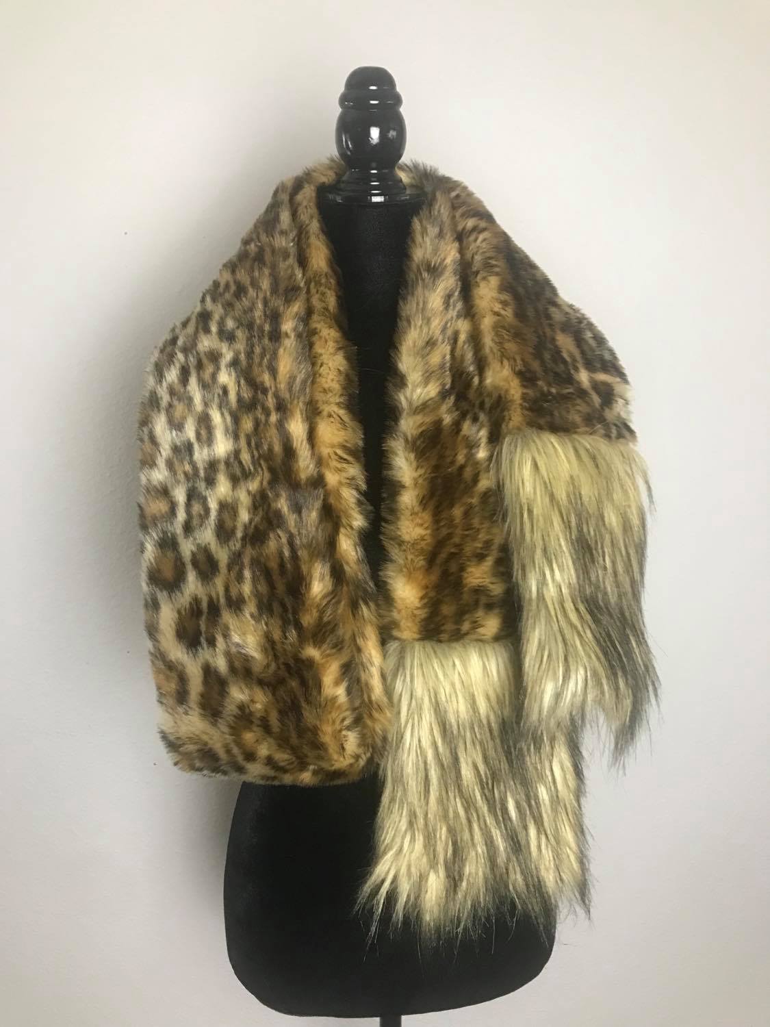 This is Leopard fur with cut trim longer fur in brown. Length 88" x 5.5" wide.
